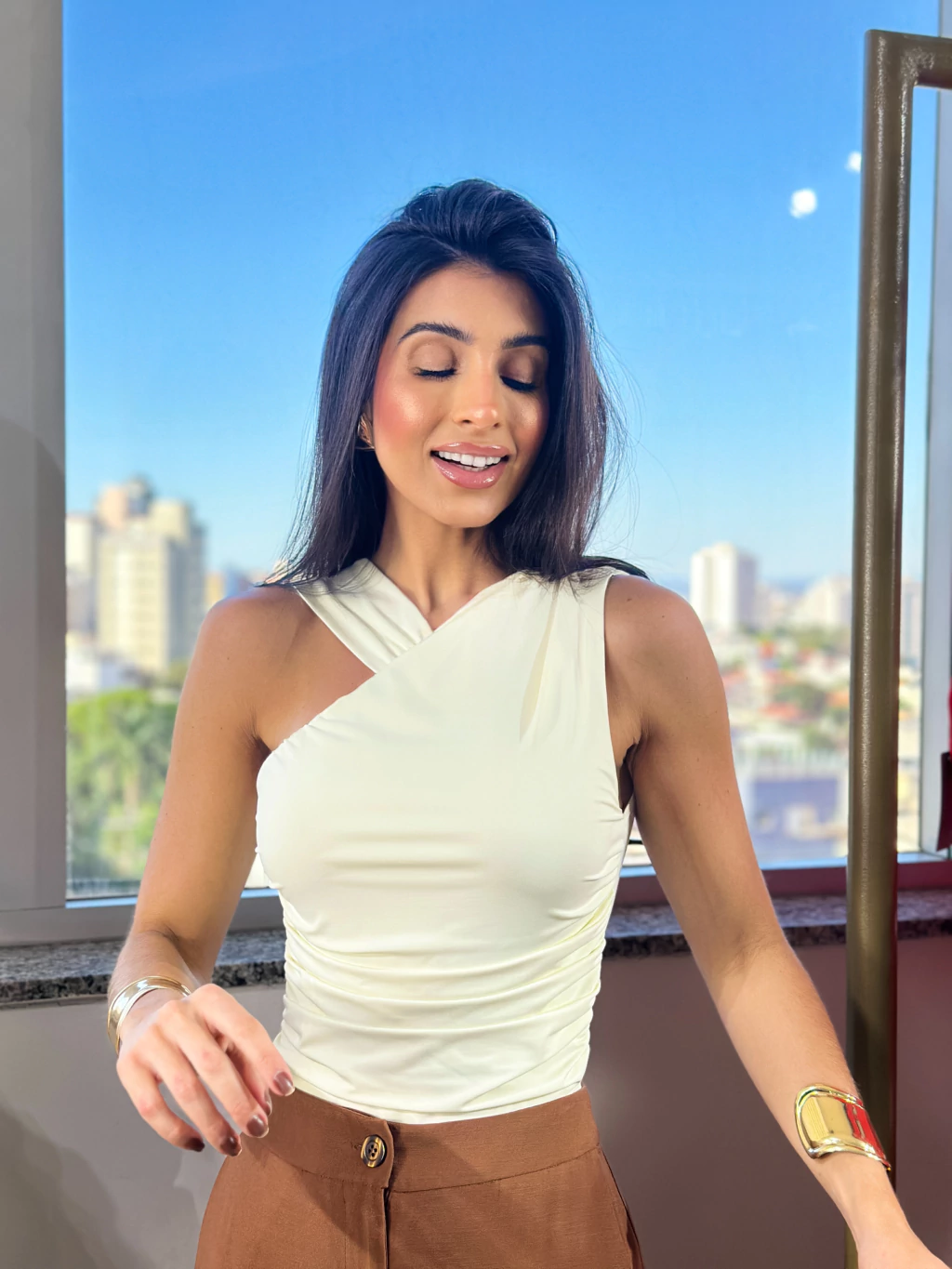 Seu design único traz um drapeado lateral elegante e forro duplo na frente, garantindo um acabamento impecável e conforto extra. O detalhe assimétrico confere sofisticação e modernidade, tornando o Body Mia perfeito para looks marcantes.