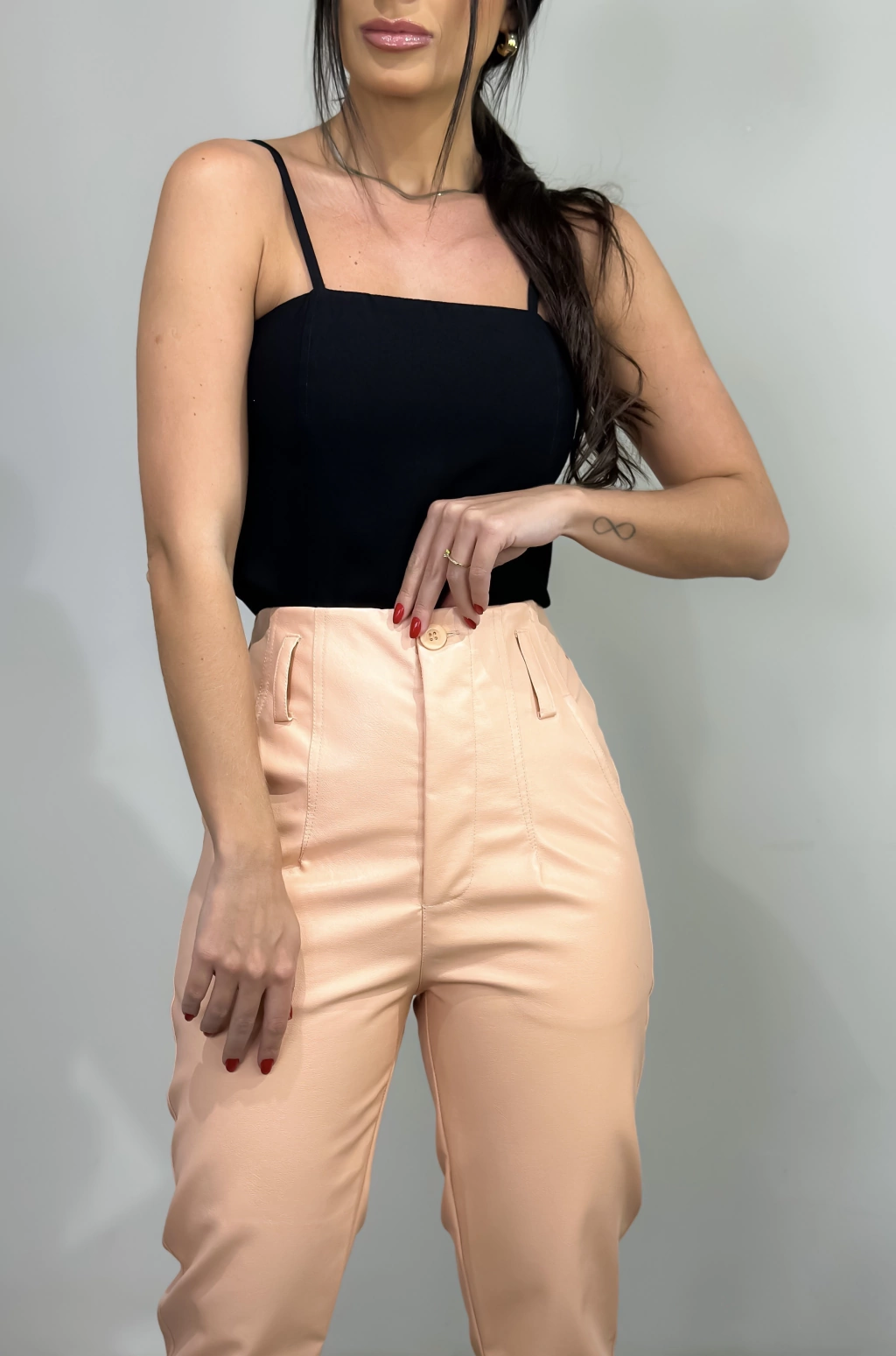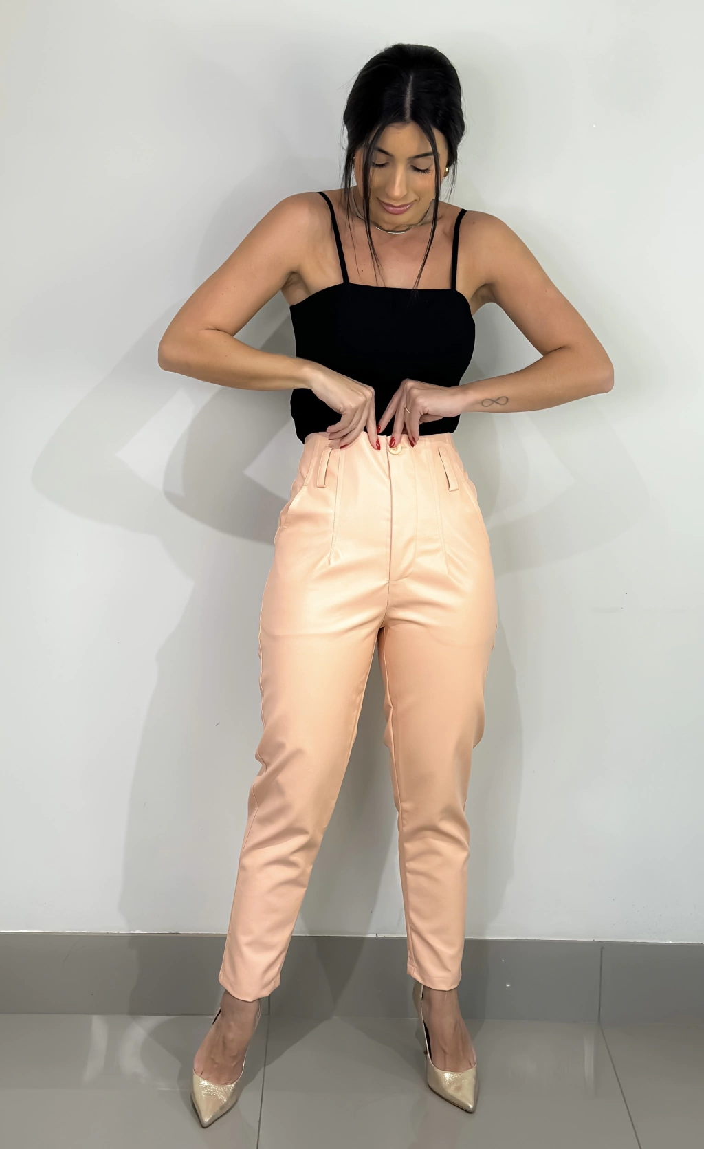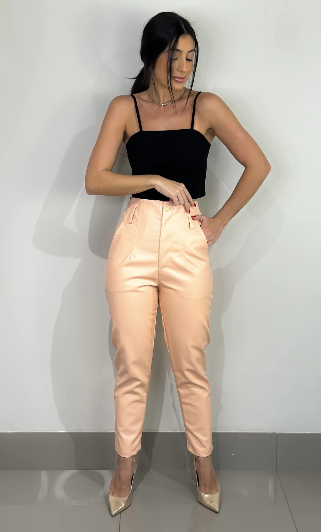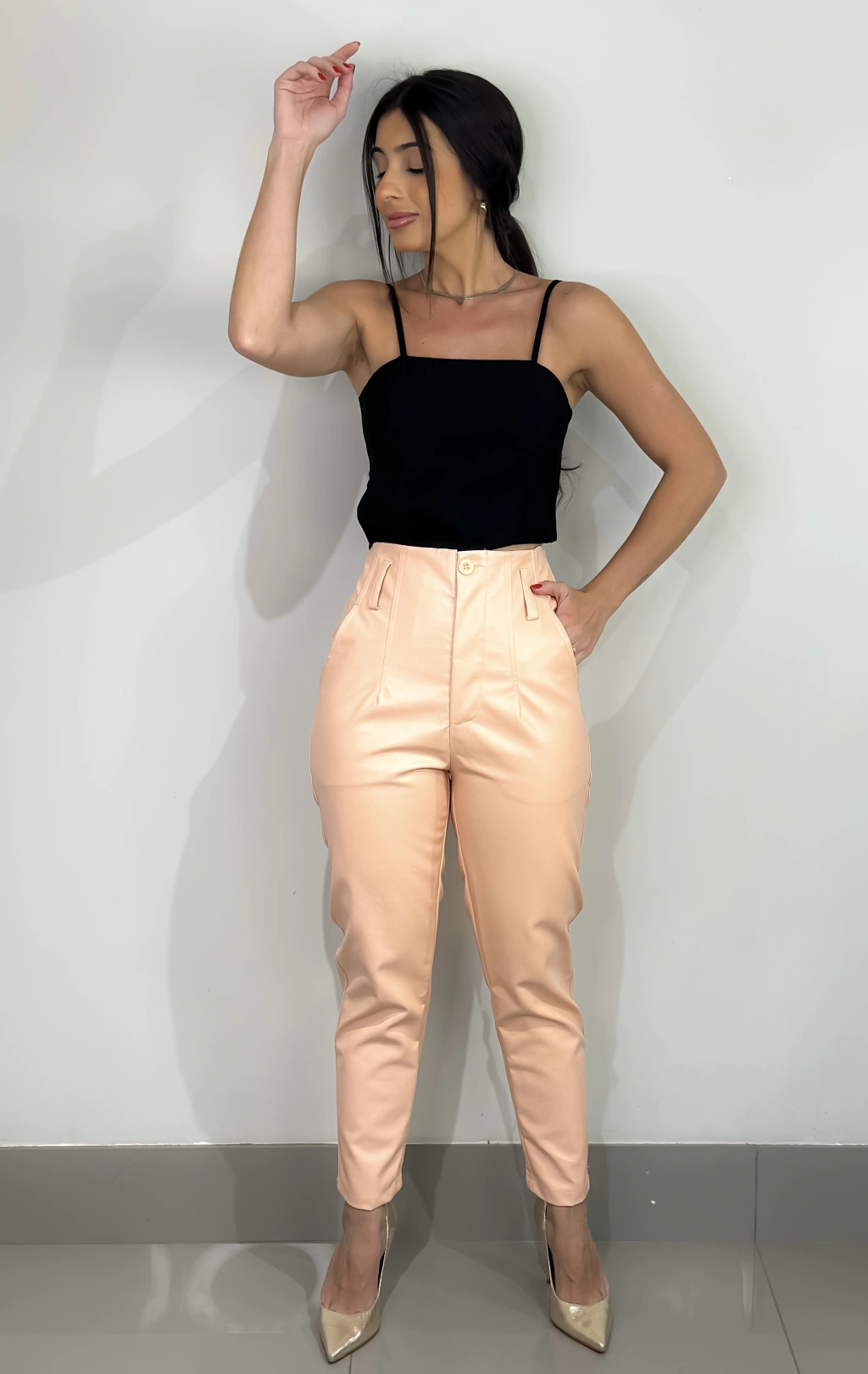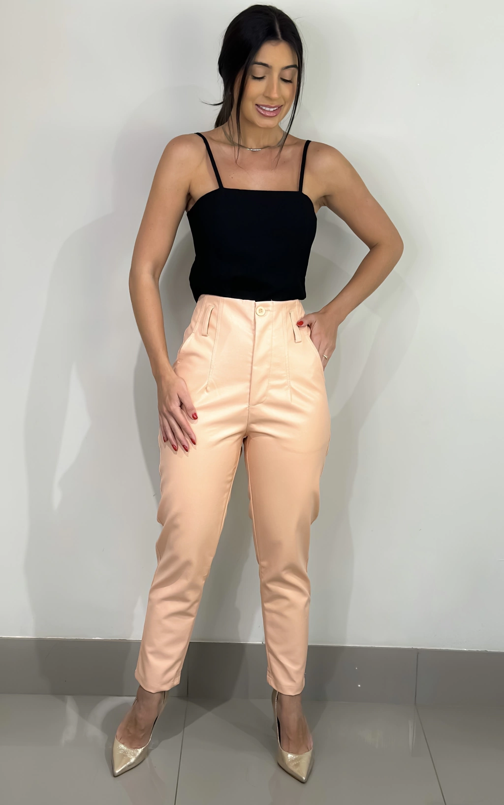 Calça skinny no couro ecológico, com corte reto, cós alto, bolsos faca laterais, bolsos atrás, passante para cinto, fechamento de botão.