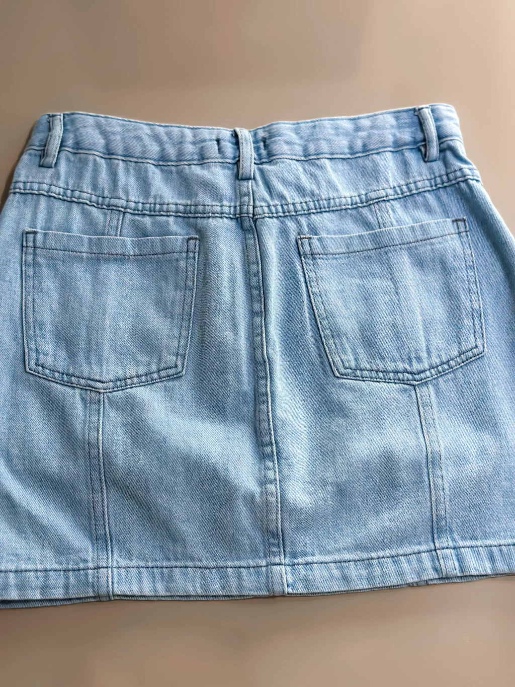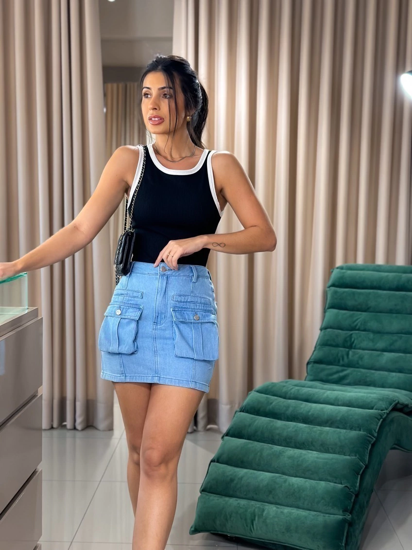 Mini saia cargo no jeans na lavagem azul claro com cós alto e corte reto, ajustado no quadril. Possui máxi bolsos nas laterais com fechamento de botões metálicos e bolsos retos decorativos.