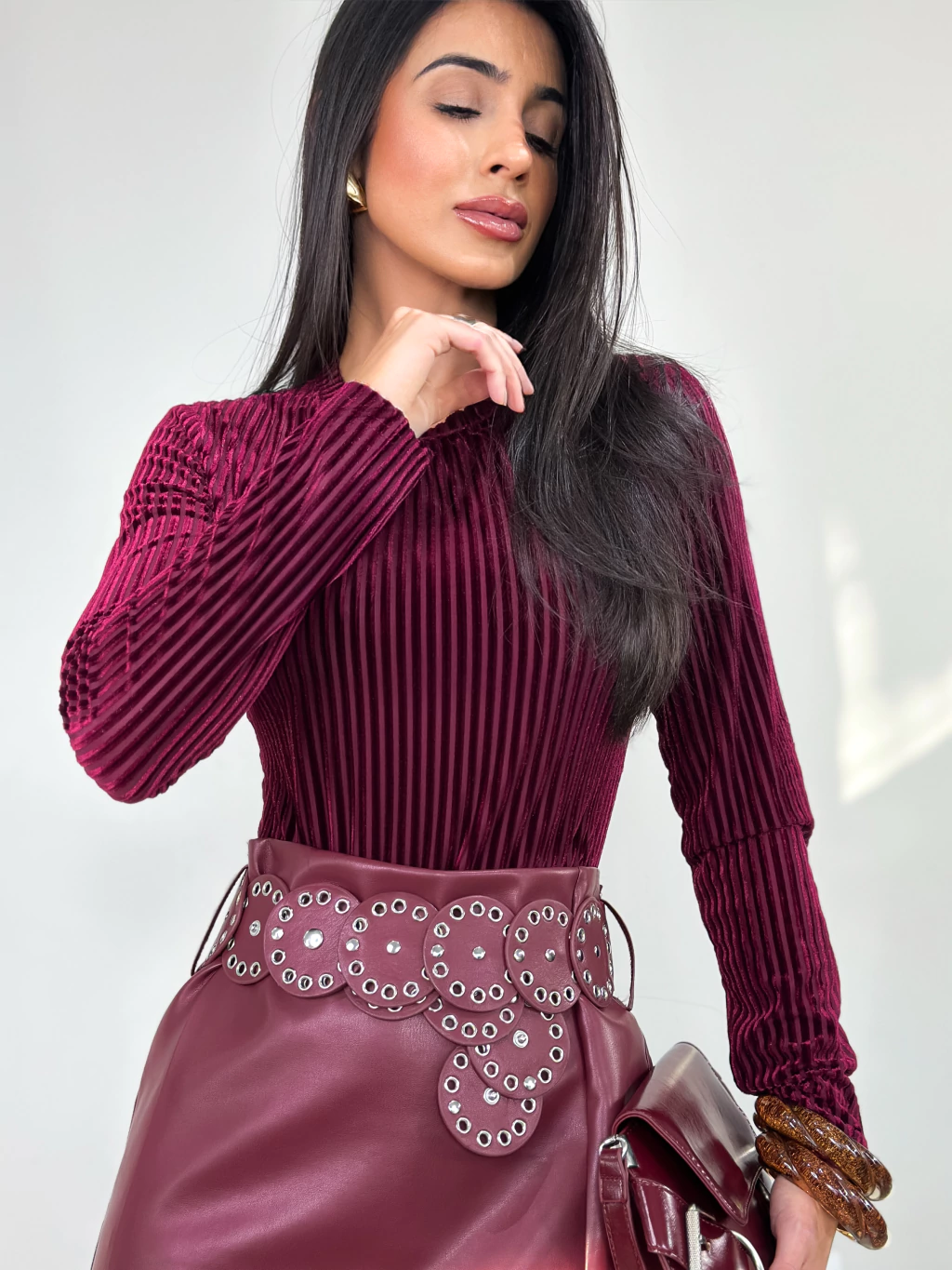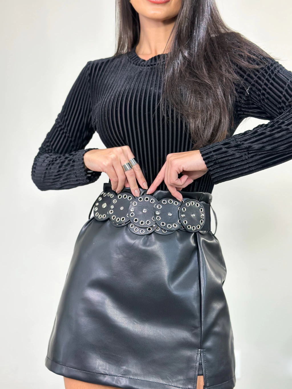 O Short Saia Couro Ecológico Eliete é uma peça-chave que combina estilo e versatilidade para o seu closet. Seu design exclusivo apresenta saia na frente e short atrás, com cós alto acinturado, zíper invisível e passantes, garantindo um caimento perfeito e confortável.