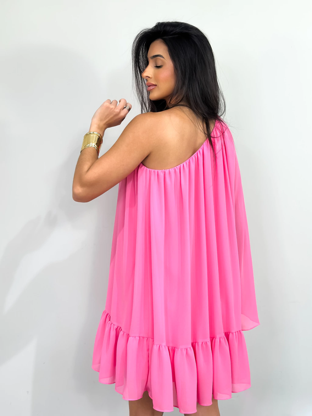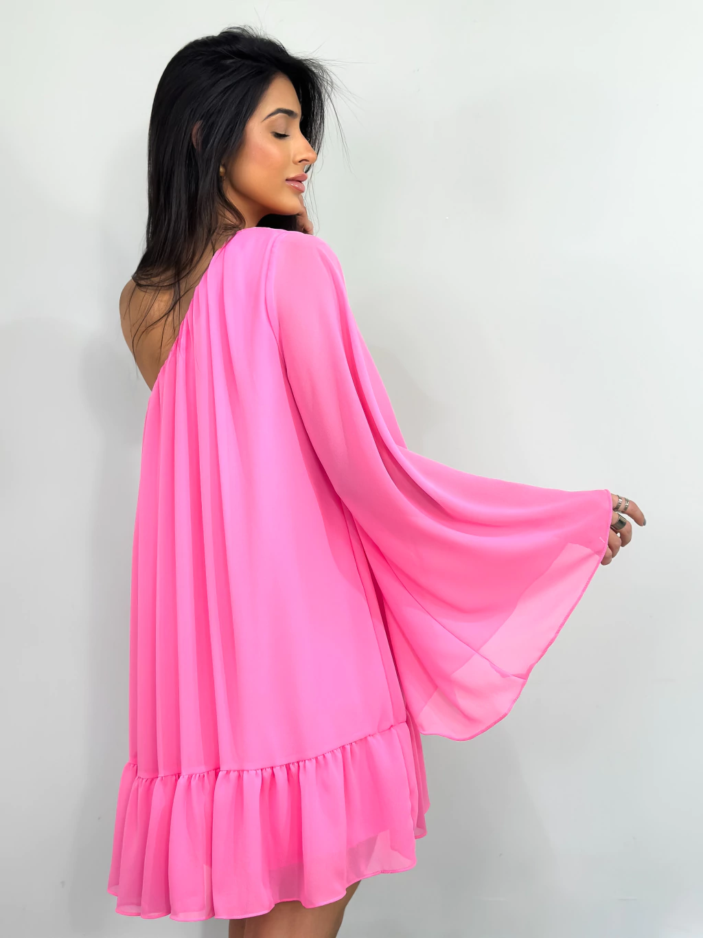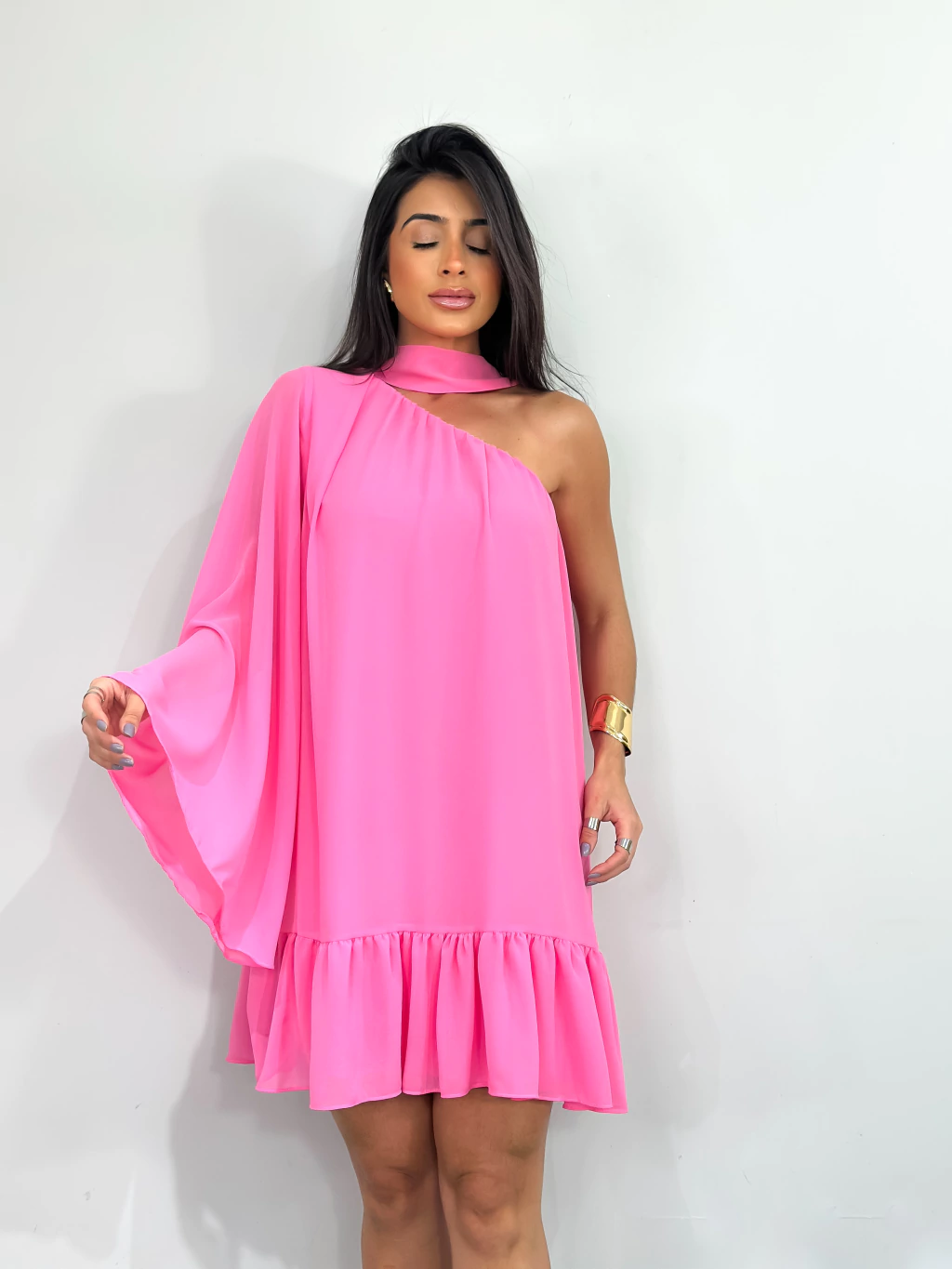 Confeccionado em tecido chiffon, o Vestido Geórgia destaca-se pelo seu caimento leve e fluido, que realça a feminilidade com sutileza. O modelo um ombro só, possui manga flare ampla, que confere um toque moderno e diferenciado, perfeito para quem busca um visual único e sofisticado.