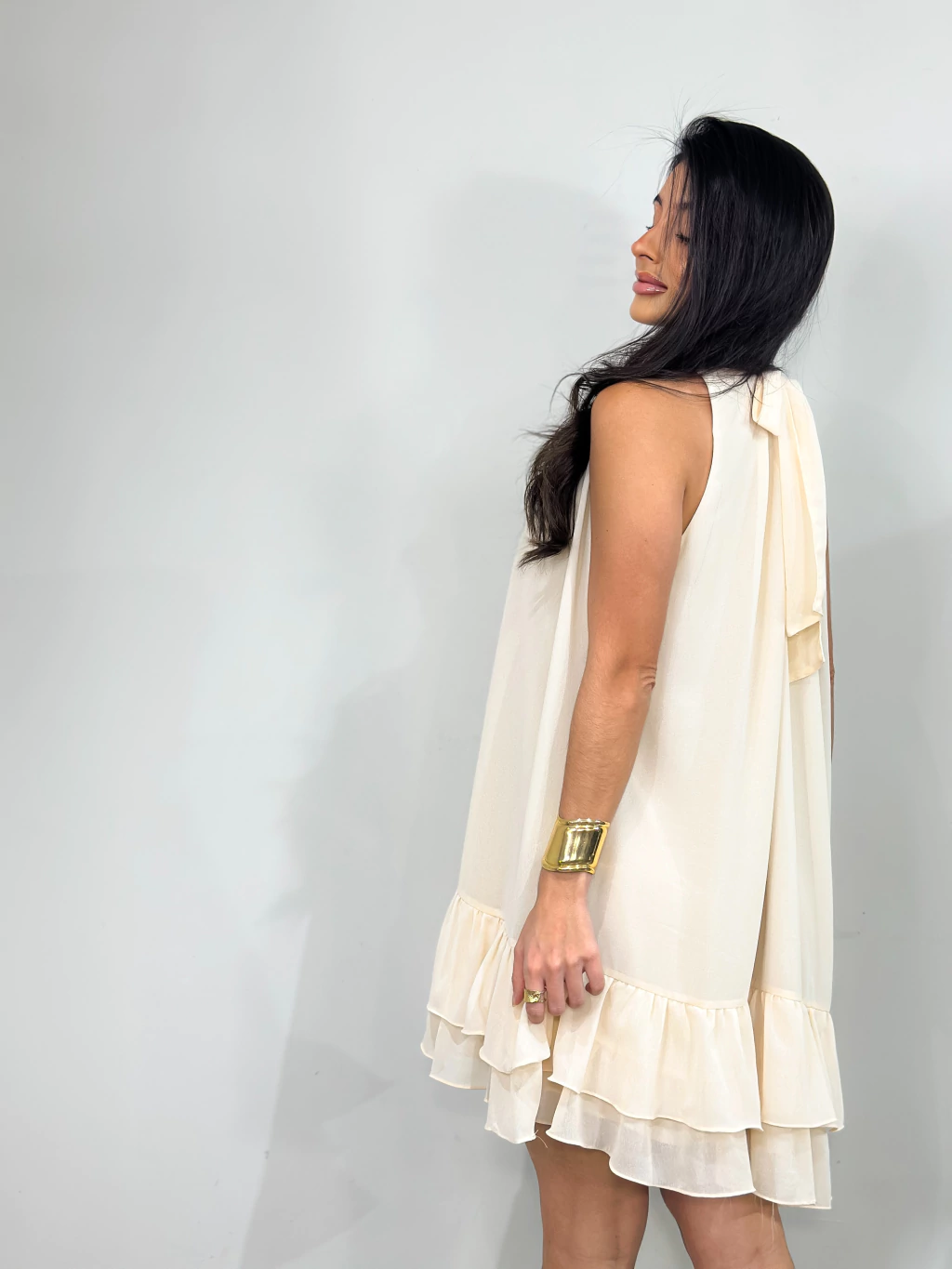 Confeccionado em chiffon leve e com movimento fluido, o Vestido Rebeca destaca-se pelo seu corte amplo e o barrado com camada dupla, que garante um toque romântico e um caimento especial. A gola média com amarração nas costas permite ajusta-lo de forma confortável ao seu estilo, seja com laço ou nó.